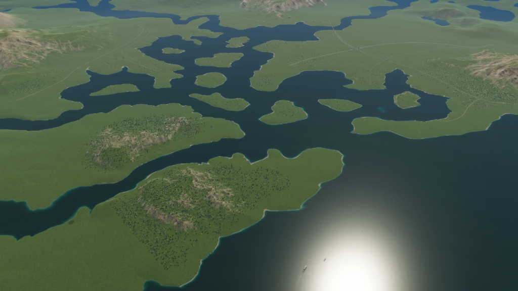「サンクチュリアベイ」を使用します。資源や高速道路・鉄道が豊富です。島がたくさんあるので、「Bridge & Ports」で実装された吊り橋や昇開橋がたくさん使えそうですね。