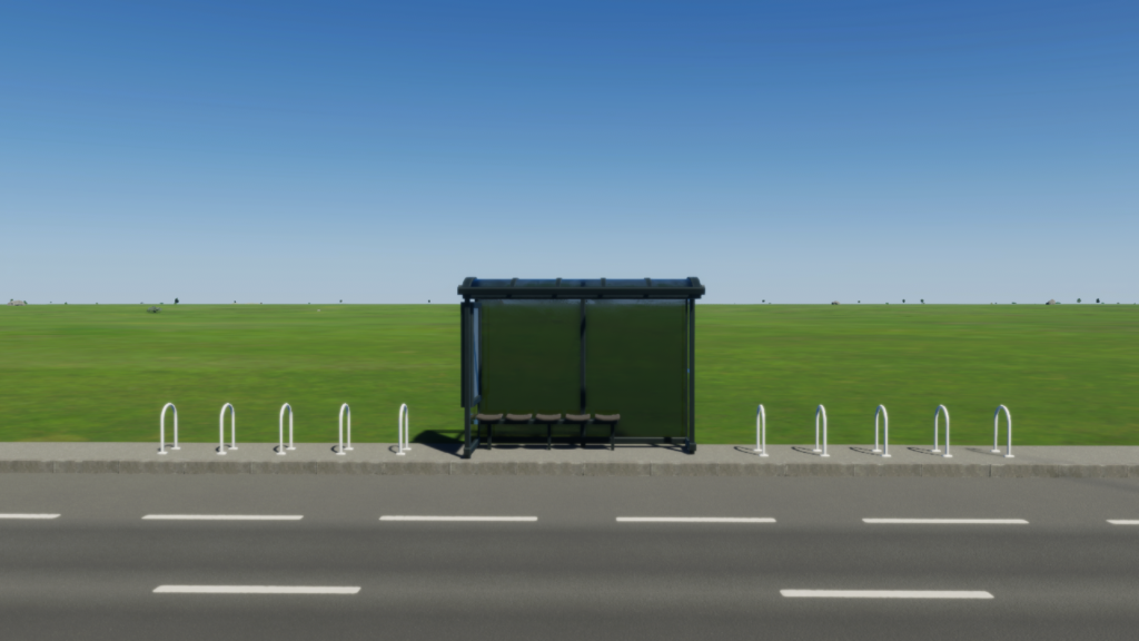 屋根が付いたバス停です。屋根が付いているので、「バス停標識」よりも快適性が上がります。1マス幅の道路には設置できません。