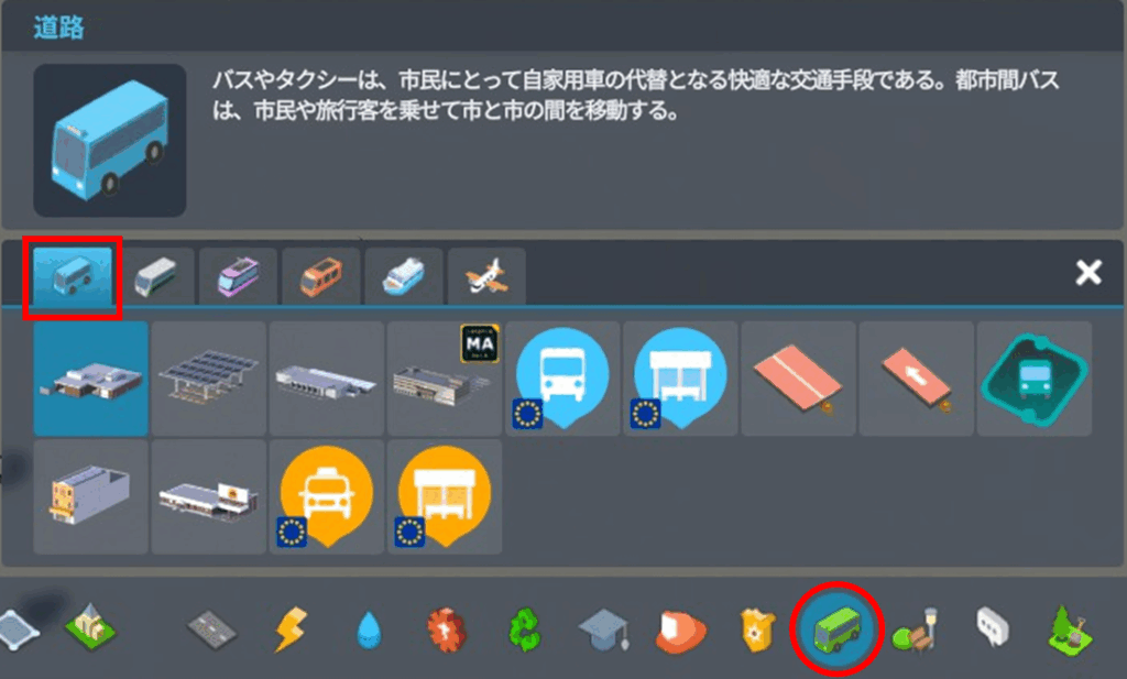 基本交通サービスをアンロックすることで、「バス車庫」、「バスターミナル」や「バス停標識」・「バス停シェルター」を設置し、路線を設定することで、初めてバスを走らせることができるようになります。ゲーム画面下の「交通」のタブの中に「道路」というタブがあるので、そこから必要なものを選んで、バス路線網を作ります。