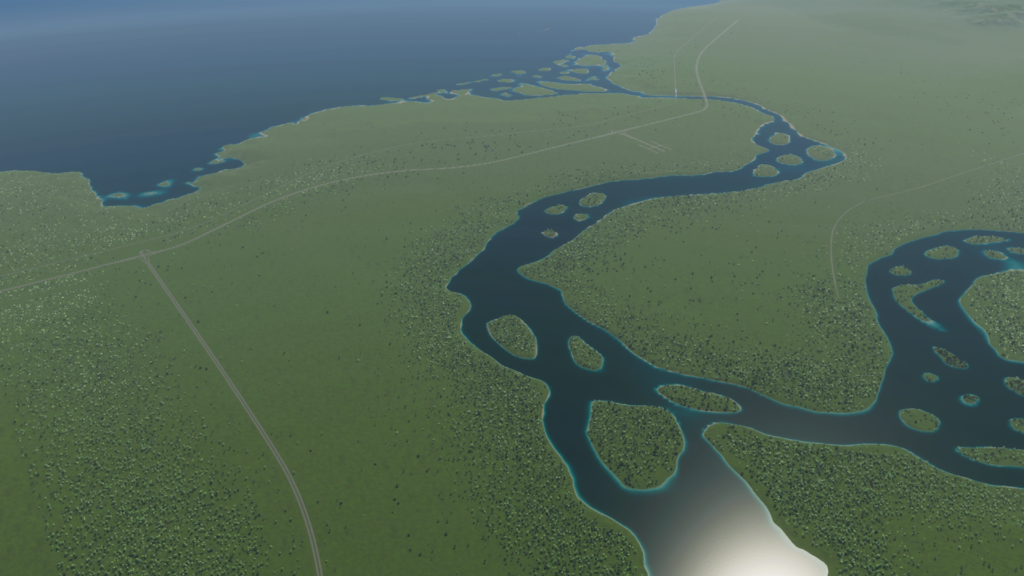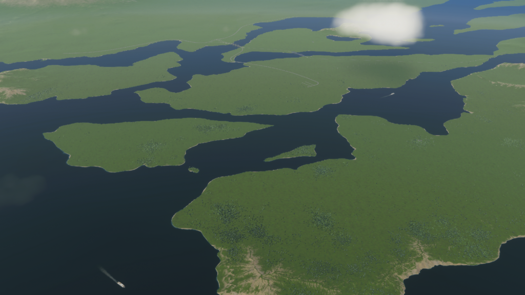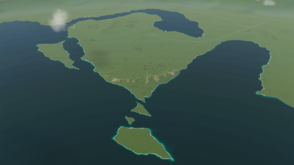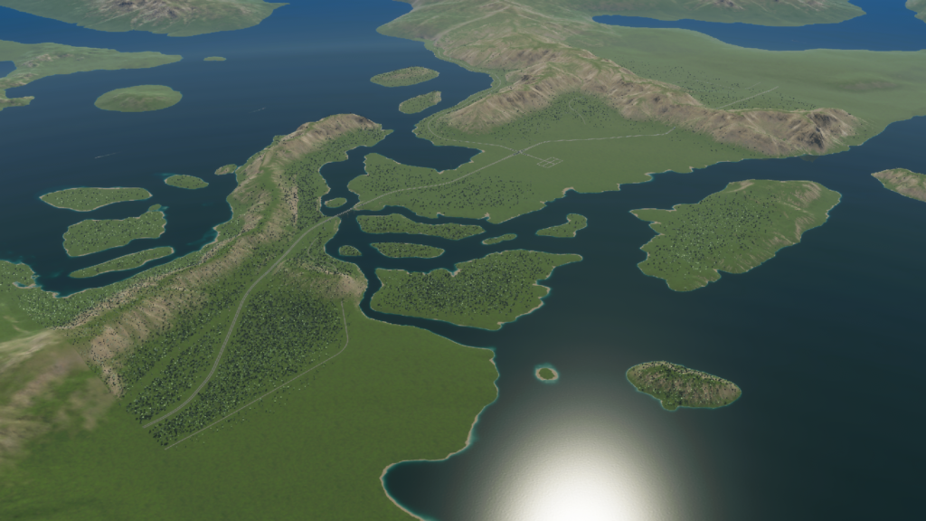 天然資源に恵まれた、海岸沿いに広がる広大な土地です。中央に大きな湖があり、いい感じの大きさの島が散らばっています。外部接続が豊富です。
