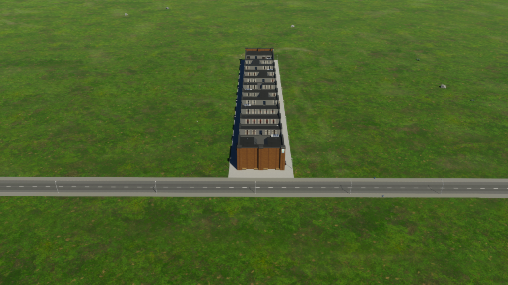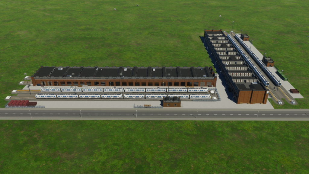 メインの建物が道路に対して垂直に伸びている車両基地です。一つの車両基地から5本の地下鉄車両を出せます。