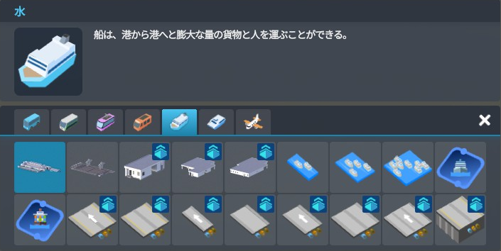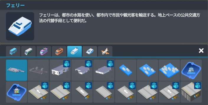 都市外からの交通機関だけでなく、都市内での輸送機関としても使用できます。都市外との輸送向けは「水」、都市内での輸送向けは「フェリー」と、メニューが分けられています。