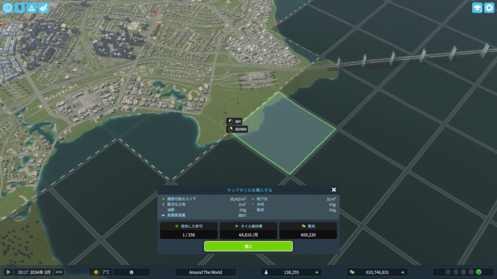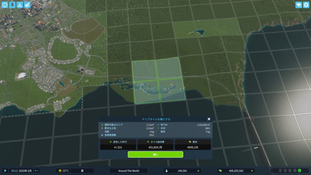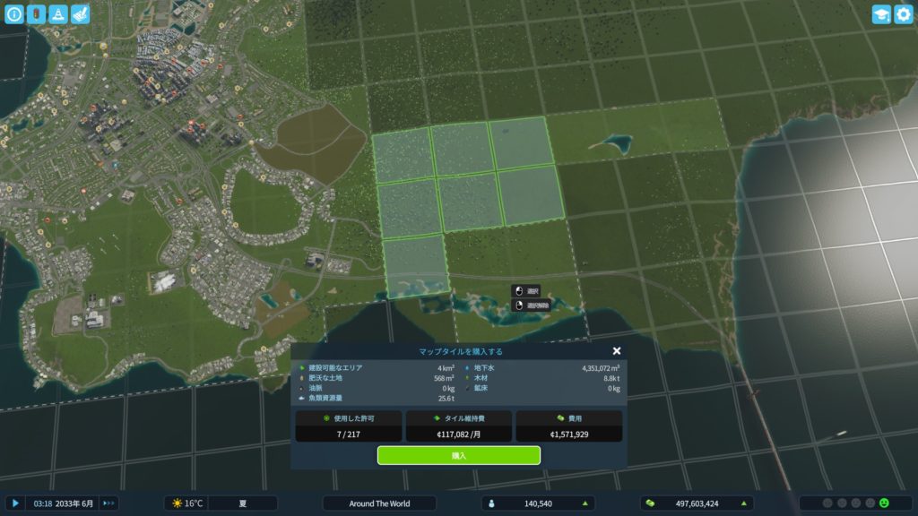 まずは、安定の土地購入から。今回は、貨物港に鉄道も通すやり方にするので、海沿いの土地を買います。