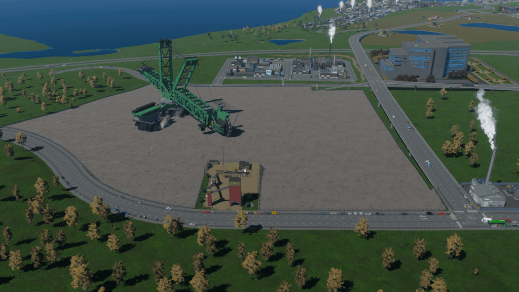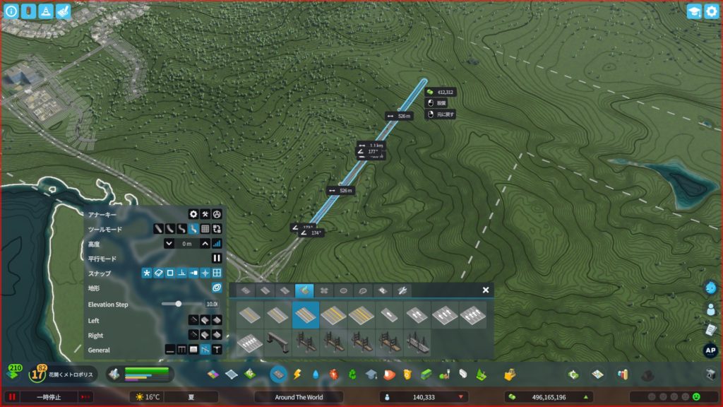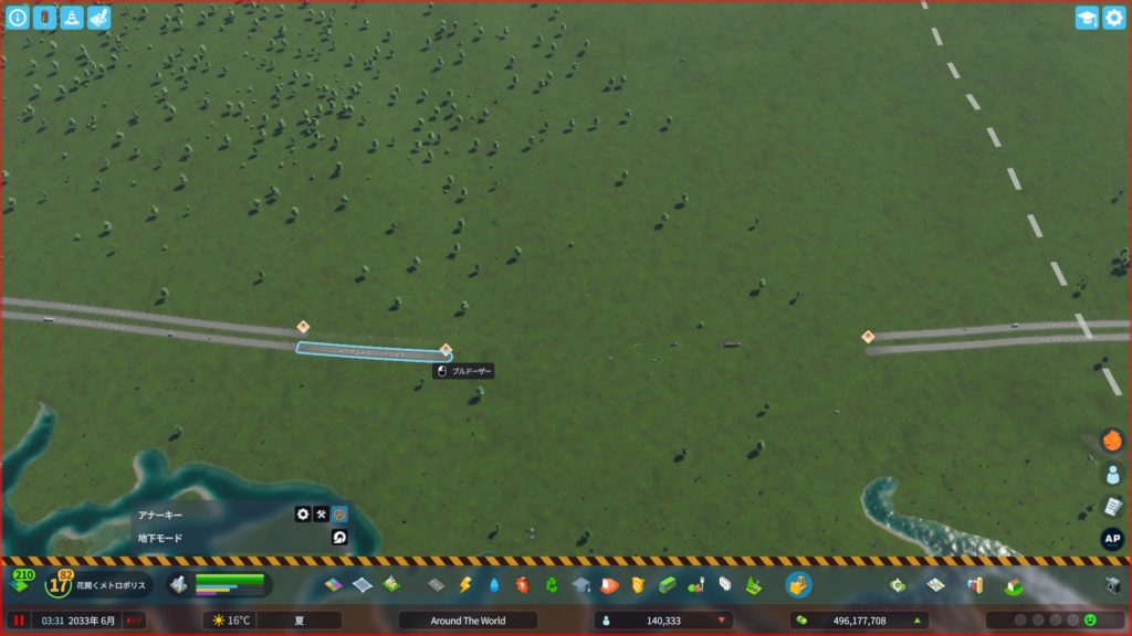 さっき作ったインターチェンジから原油のほうまで、道路を敷きます。高速道路からつながる道路なので、地形を無視してまっすぐ敷きます。