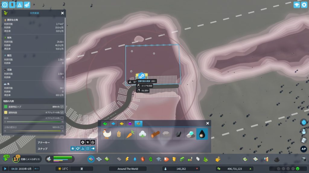 マップタイルの画面を開いてから「天然資源」の情報ビューを開き、原油が埋まっている場所を探します。