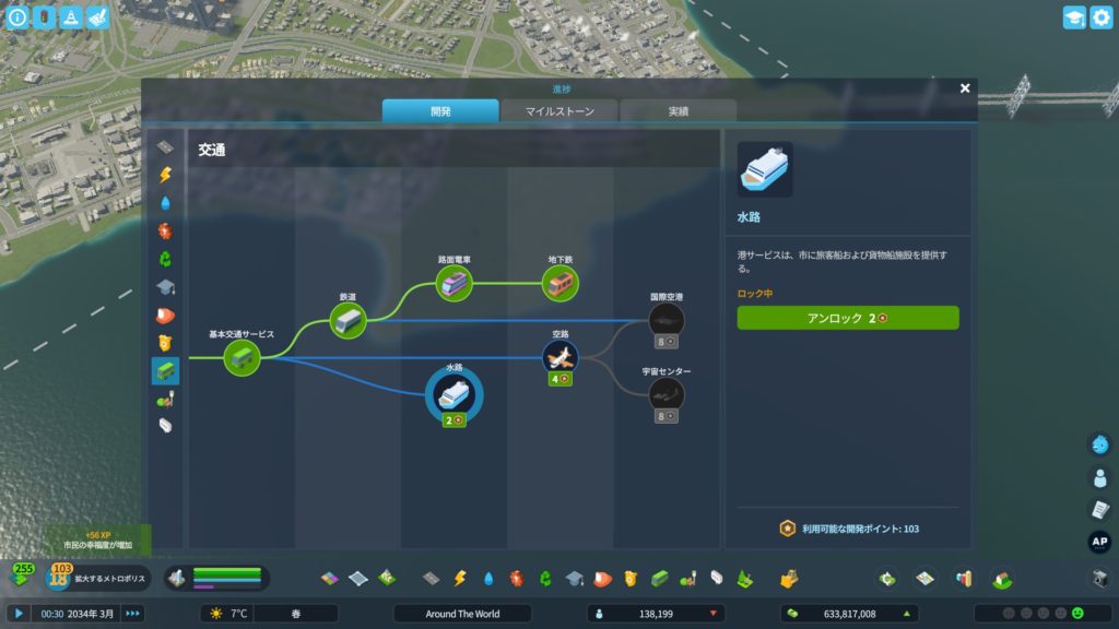 船を走らせるために、「交通」の開発ツリーから「水路」をアンロックします。