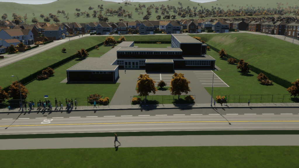 セカンダリスクールの裏に「郊外のプライマリースクール(イギリス風)」(=小学校)を建設します。