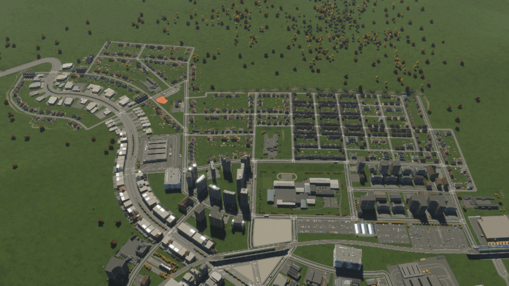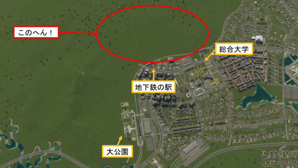 早速、UK Packの建物をバンバン建てていこうと思います。今回、開発する場所は、総合大学と大公園の間にある駅の近くにします。