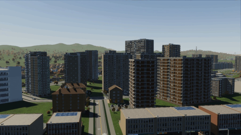 6車線の道路沿いには、複合住宅(イギリス風)を建てます。街がほどよく栄えている感が出るのに加え、住民も増やせるので、個人的に一石二鳥です。