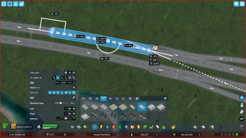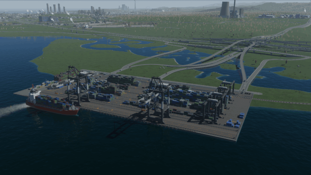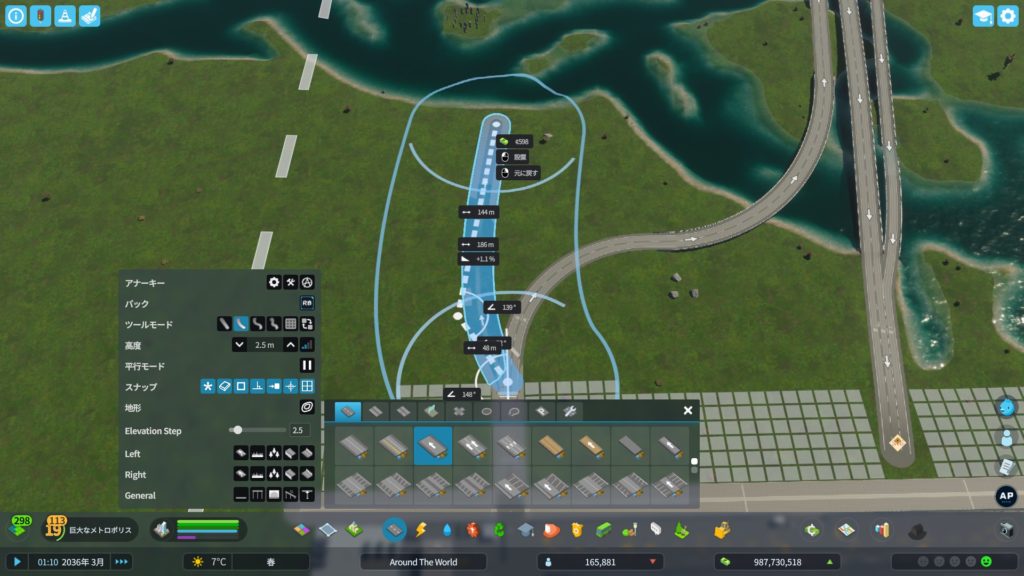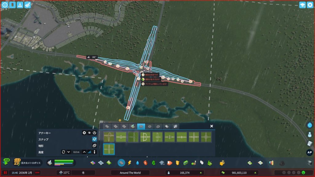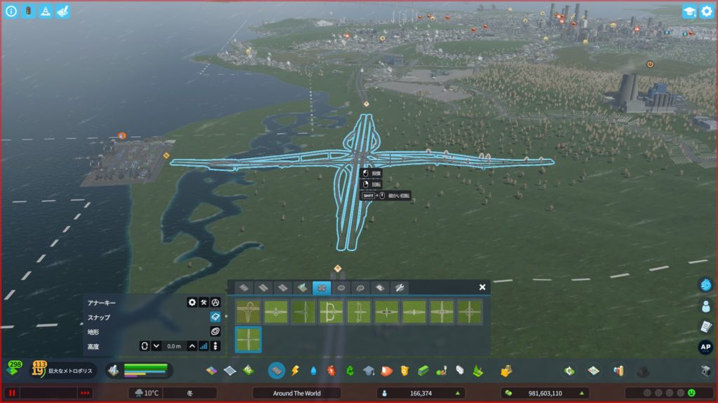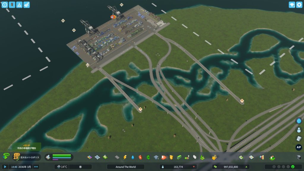 次に、高速道路からアクセスする道路を作ります。貨物港周辺はめっちゃ混むので、できるだけ渋滞しにくい構造の道路にする必要があります。ということで、「4階層スタックインターチェンジ」をこの辺に建てようかな…
