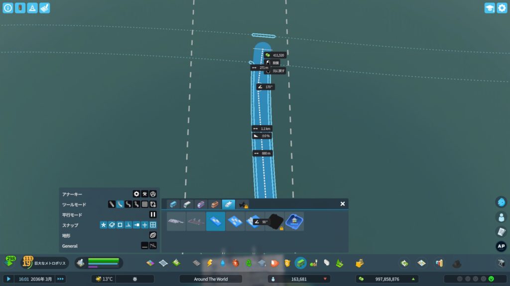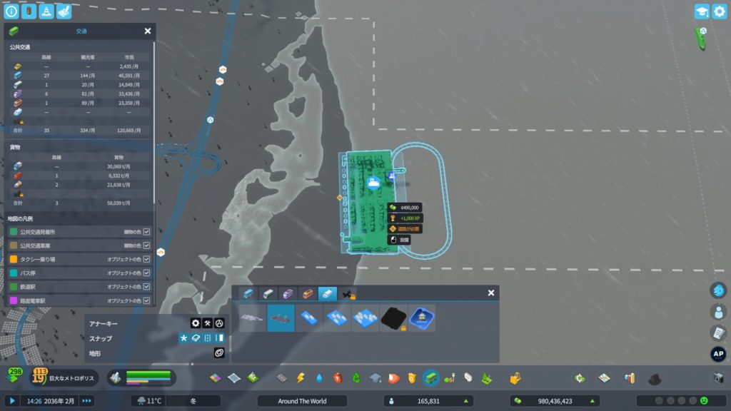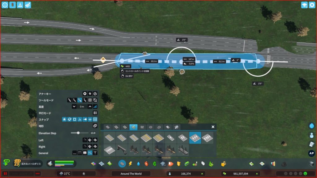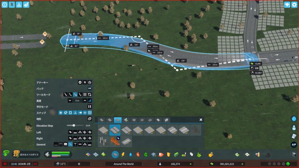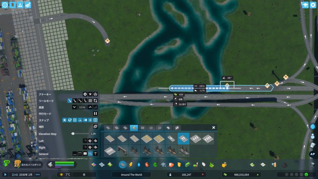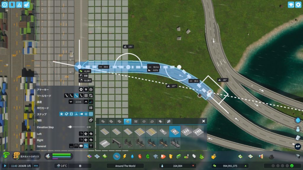 次に、高速道路からアクセスする道路を作ります。貨物港周辺はめっちゃ混むので、できるだけ渋滞しにくい構造の道路にする必要があります。ということで、「4階層スタックインターチェンジ」をこの辺に建てようかな…
