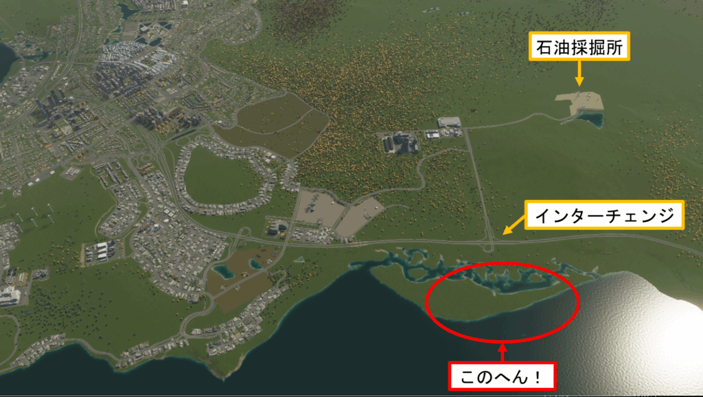 工業団地が拡張されそうなところに、新しい貨物港を建設します。場所は、石油採掘所の近くに作ったインターチェンジの裏側にします。インターチェンジを改造して、新しく建てる貨物港に高速道路からアクセスできるようにします。