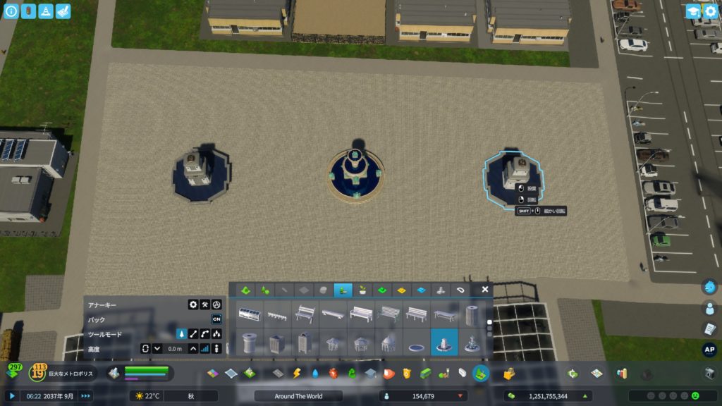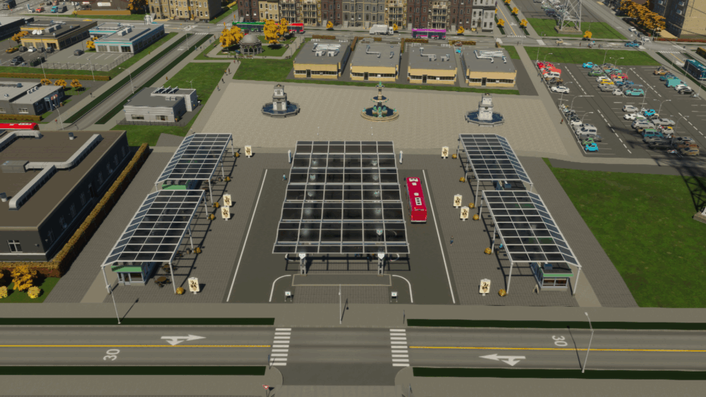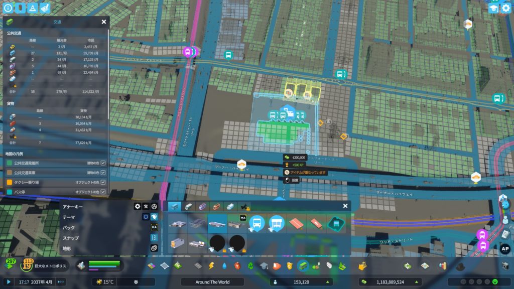 次に、バスターミナルを建てます。記事にはしていないのですが、開発中の街ではバス路線をクモの巣のように張り巡らせています。それを駅基準のバス路線網に切り替えるため、多方面のバスが一か所で発着できるようにします。