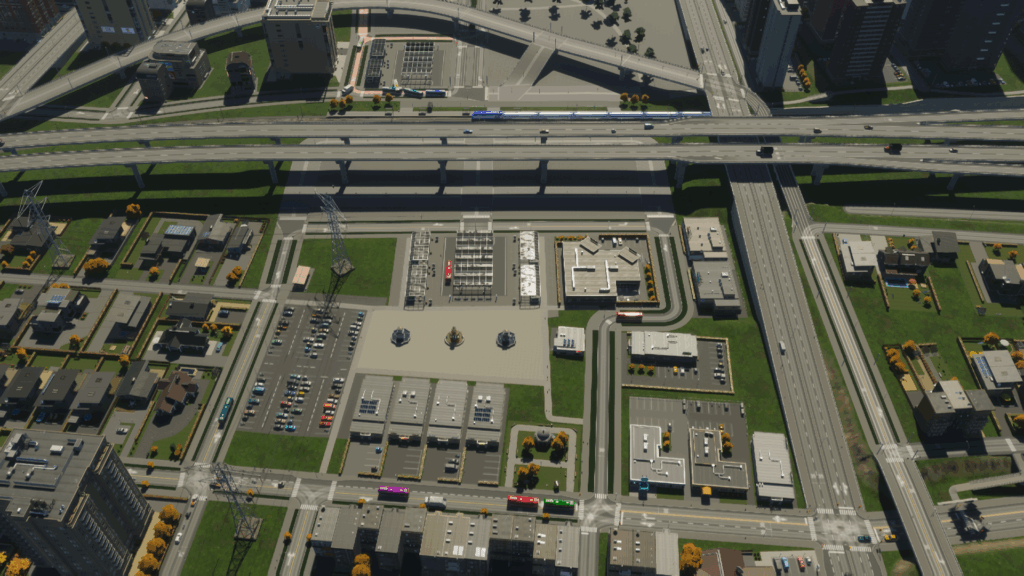 次は(というか最後に)、今回のメイン事業である駅裏です。高速道路の下は何もない空き地です。もう少し装飾しても良かったから。あと、空いた土地に小さめのオフィスを建てて、駅の周りという感じを出しました。