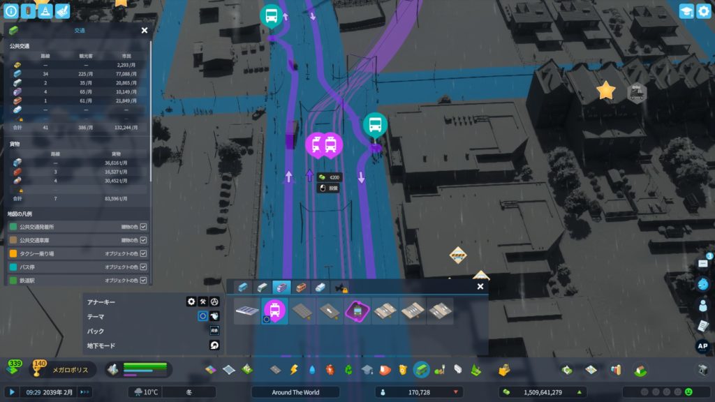 前回(Part 29)で作った日本っぽい街は、ここまで発展しました。CSL2あるあるですが、中密度○○住宅以上の建物がある程度建つと、バスだけでは乗客を運びきれなくなります。で、実際、日本っぽい街と鉄道駅を結ぶバスでそうなりました。